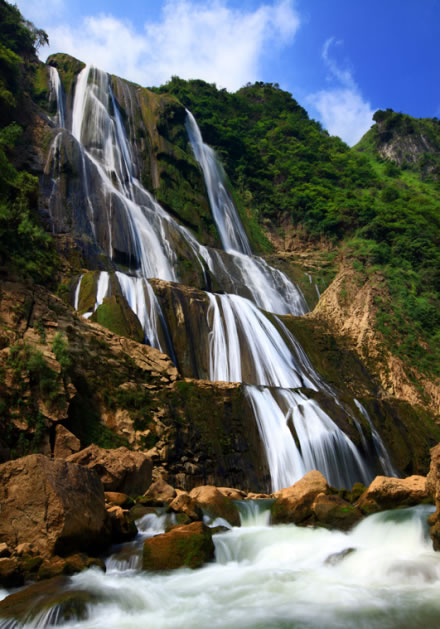 滴水灘瀑布位于黃果樹瀑布以西8公里,總高度和個體都為黃果樹瀑布群之首。這里兩山對峙,東為大坡頂,西為關(guān)索嶺,中間是深達700米的霸陵河峽谷,瀑布就掛在關(guān)索嶺大山上。滴水灘瀑布總高410米,為黃果樹瀑布的五倍,最下層134米,雄偉磅礴。