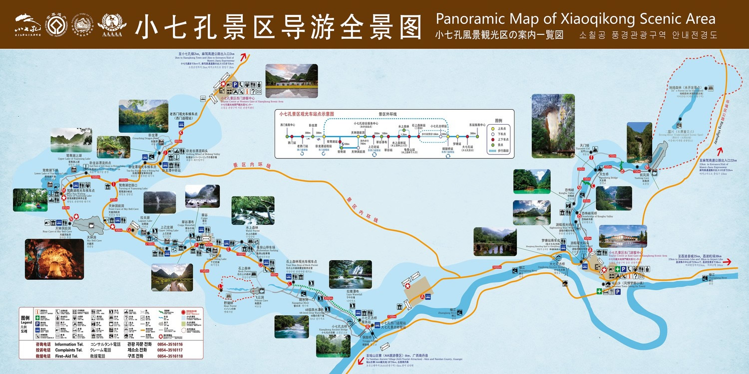 小七孔古橋建于清道光十五年(1835年),古為黔南通往廣西商旅交通要道,橫跨響水河。橋長40米,寬2.2米,高5.5米,橋體取拱形,結構玲瓏。橋首原存石碑兩座,一為《修碑》,銘筑橋功德;一為《萬古興橋碑》,刻有“群山巖浪千千歲,響水河橋萬萬年”聯(lián)句。橋腹七孔,俗稱“小七孔古橋”。主要有小七孔古橋、拉雅瀑布、68級跌水瀑布、石上森林、野豬林、水上森林、天鐘洞、臥龍?zhí)、鴛鴦湖等21個景點。