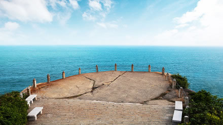 觀日巖位于蜈支洲島的東南懸崖處。站在巖上憑海臨風(fēng),俯瞰全島,遼闊的南海盡收眼底。懸崖下面,怪石嶙峋。 風(fēng)平浪靜之時(shí),乘快艇環(huán)島游,石景千奇百怪,觀日巖像一尊天然大石佛,面向大海,日夜修煉。新世紀(jì)的曙光從這里升起,緋紅的太陽從海面上徐徐上升,形成海天一色的海上觀日點(diǎn)。住島客人若欲觀看日出,可向酒店前臺(tái)咨詢?nèi)粘鰰r(shí)間。