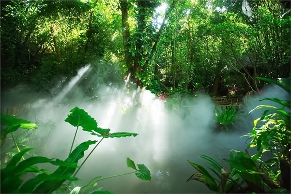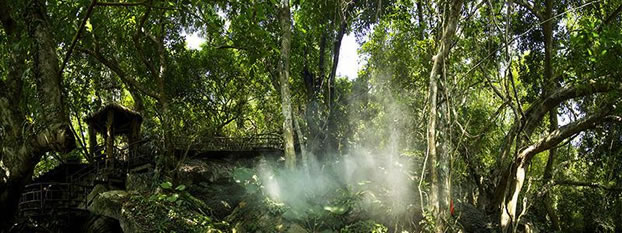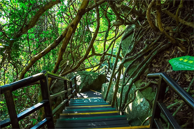 雨林谷以展現(xiàn)原生態(tài)的熱帶雨林景觀為核心,匯集參天巨榕、百年古藤、黑桫欏、仙草靈芝、見血封喉、野生桄榔以及“高板根”“根抱石”“空中花園”“老莖結(jié)果”“植物絞殺”“藤本攀附”熱帶雨林的六大奇觀等。雨林谷是“天然氧吧”和負(fù)氧離子發(fā)生器,此地年平均溫度24度。雨林谷游覽通道由木棧道、野趣石階、吊橋組成,長達(dá)3.5千米,分為大、中、小三個(gè)環(huán)行線路。