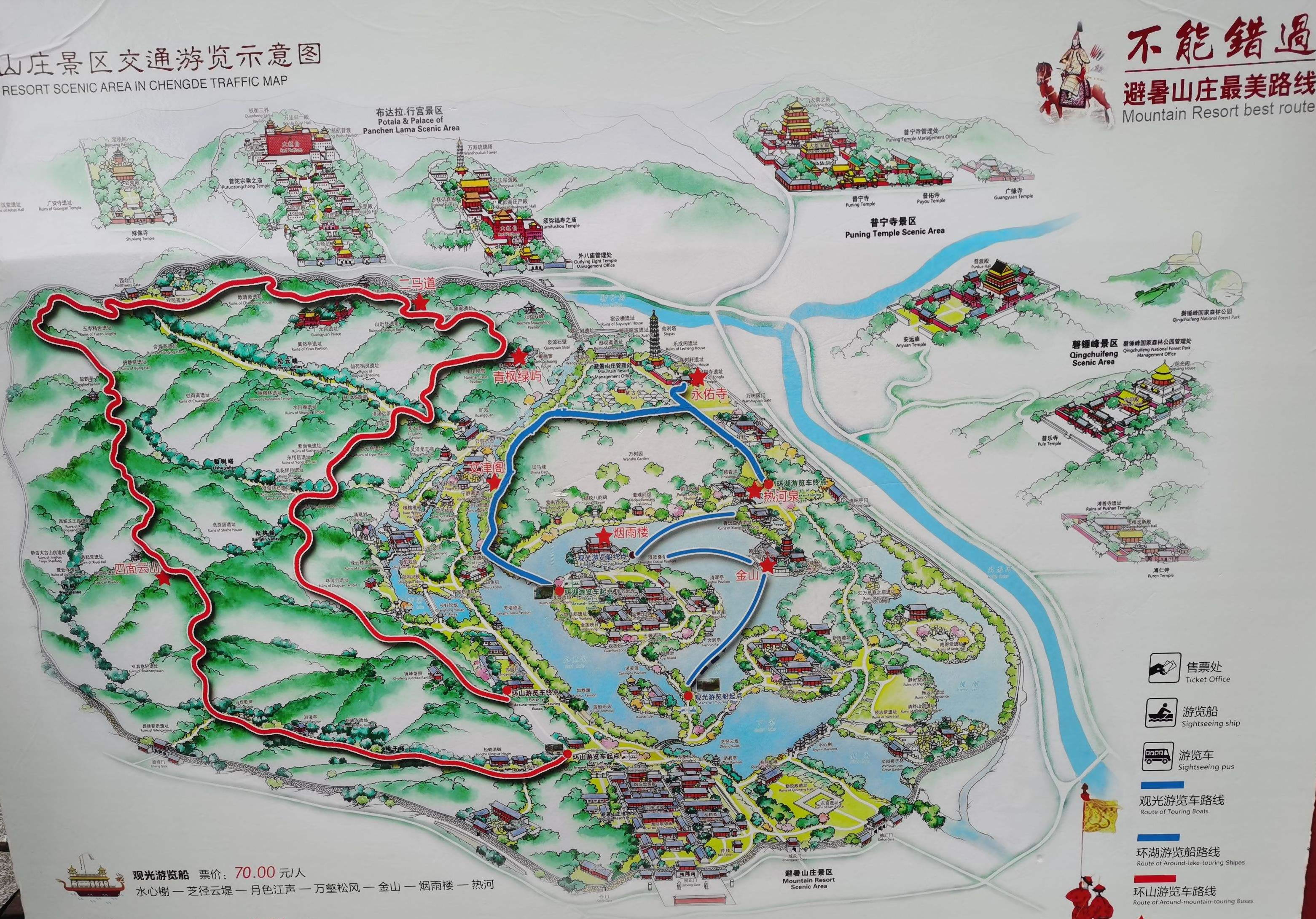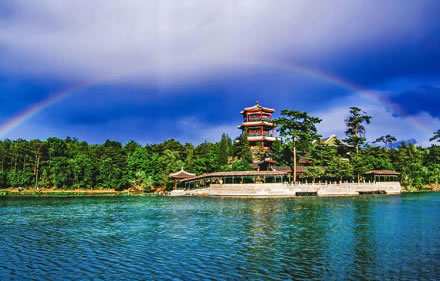 湖泊區(qū):苑景區(qū)的精華基本上在湖泊區(qū),康熙曾夸耀說(shuō),“天然風(fēng)景勝西湖”。由于洲島錯(cuò)落,湖面被長(zhǎng)堤和洲島分割成5個(gè)湖,各湖之間又有橋相通,兩岸綠樹(shù)成蔭,山莊主要的風(fēng)景建筑又都散落在湖區(qū)的周圍,因此顯得曲折有致,秀麗多姿。湖泊區(qū)位于山莊東南,面積49.6萬(wàn)平方米。有大小湖泊八處,即西湖、澄湖、如意泅、上湖、下湖、銀湖、鏡湖及半月湖,統(tǒng)稱為塞湖。 湖區(qū)的風(fēng)景建筑大多是仿照江南的名勝建造的,如“煙雨樓”,是模仿浙江嘉興南湖煙雨樓的形狀修的。金山島的布局仿自江蘇鎮(zhèn)江金山。湖中的兩個(gè)島分別有兩組建筑,一組叫“如意洲”,一組叫“月色江聲”!叭缫庵蕖鄙嫌屑偕健鐾、殿堂、廟宇、水池等建筑,布局巧妙,是風(fēng)景區(qū)的中心!霸律暋笔怯梢蛔碌乃暮显汉蛶鬃ぁ⑻媒M成。每當(dāng)月上東山的夜晚,蛟潔的月光,映照著平靜的湖水,山莊內(nèi)萬(wàn)籟俱寂,只有湖水在輕拍堤岸,發(fā)出悅耳的聲音,“月色江聲”的題名便是由此而來(lái)。湖泊區(qū)集南方園林之秀和北方園林之雄,將江南園林的景觀移植到塞外。區(qū)內(nèi)湖泊總稱“塞湖”,總面積57公頃。