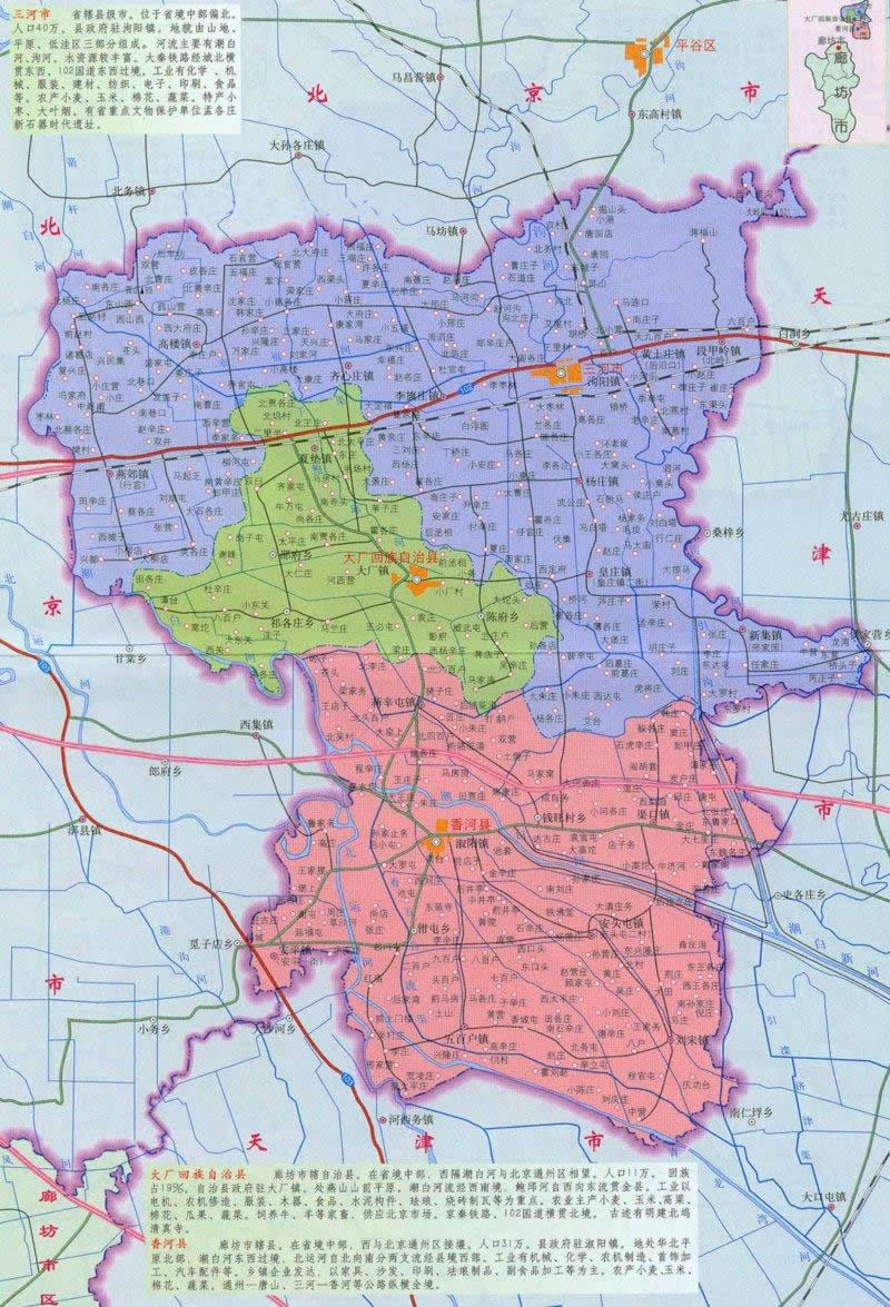 1993年經(jīng)國務院批準撤縣設市,現(xiàn)轄10鎮(zhèn)2區(qū)(燕郊省級經(jīng)濟技術開發(fā)區(qū)、省級農(nóng)業(yè)高新技術園區(qū))、2個街道辦事處、395個村街。