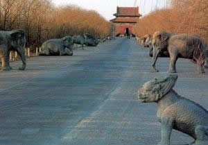 清世宗泰陵,居于清西陵陵區(qū)的中心位置,是清西陵中建筑最早、規(guī)模最大的一座。其余各陵分布在東西兩側。清泰陵是清西陵的首陵,埋葬著雍正帝及孝敬憲皇后、敦肅皇貴妃。位于永寧山主峰之下,始建于雍正八年(1730年)。 [18-19] 泰陵的神道,由三層巨磚鋪成,上南往北分布著40多項大大小小的建筑。第一座建筑物是進入陵區(qū)的一座聯(lián)拱式五孔橋,橋北有三座高大的石牌坊。這三座石坊,都是五間、六柱、十一樓形式,用青花石筑成,上刻有山、水、花、草、禽獸等圖形,被視為清西陵建筑藝術中具有代表性的作品。