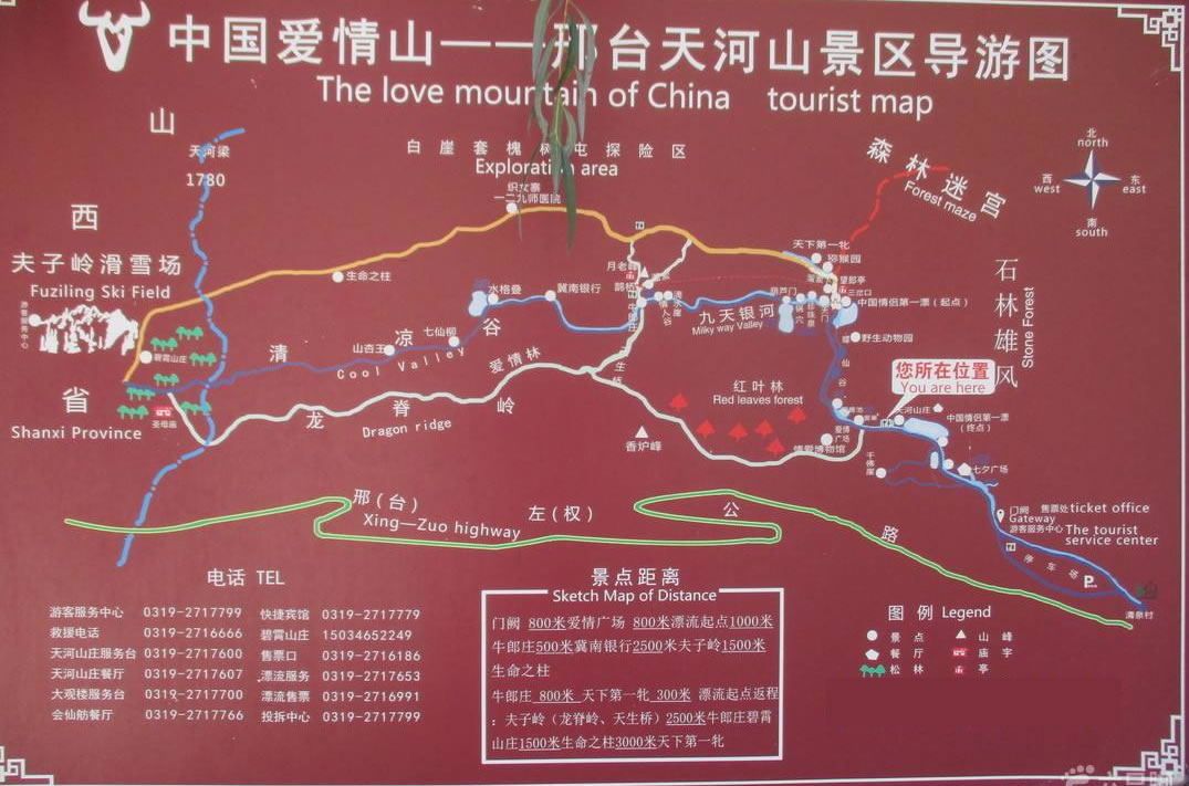 天河山景區(qū)停車場→天河湖大壩→漢闕大門→愛情廣場→摩訶池→蝶仙谷→凌波湖→凌雪湖→九天銀河谷→鴛鴦池→龍棲峽→太行石林→金猴望月→千佛壁→巨晰崖→金簪峰→凌雪山→情人谷→牛郎織女峰→牛郎莊→鵲橋→圣母廟→月老峰→玄牝之門→七夕文化陳列館→愛情文化長廊→愛情浪漫小屋