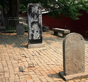 過(guò)了山門,便是甬道。甬道兩旁就是蒼松翠柏掩映下的碑林,因碑石如林故稱碑林。這里共有20多通歷代石碑,如“宗道臣?xì)w山紀(jì)念碑”、“息息禪師碑”等。在道路東側(cè)有一長(zhǎng)廊,廊內(nèi)陳列有從唐代到清代的名碑100多通,有碑廊之稱。錘譜堂就在山門內(nèi)碑林西側(cè),里面有泥塑和木雕群像。