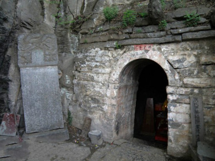 在少林寺背后五乳峰中峰上部有一天然石洞,為當(dāng)年達(dá)摩祖師九年面壁處,稱為達(dá)摩洞。禪宗初祖達(dá)摩于公元527年到536年在此洞面壁靜坐長(zhǎng)達(dá)9年。達(dá)摩洞面向西南,洞口用青石塊砌成拱門,洞深約七米,高寬各三米余。洞內(nèi)臺(tái)上有石像三尊,中為達(dá)摩坐像,兩側(cè)為其弟子。