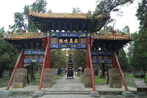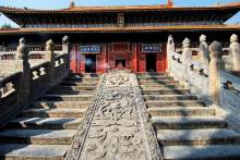峻極殿前筑有3米高的月臺,周圍有石雕欄桿,月臺正面有三道石階。中間的臺階分二路,二路間鑲有垂帶式“御路”一石,上面浮雕著精美的圖案,上截為“獨龍盤踞”,中間為“雙龍戲珠”,下邊為“群鶴鬧蓮”等紋飾。月臺下面為拜臺,左右為兩座秀麗的御碑亭,兩亭均為重檐八角,東為“御捍亭”,內(nèi)立清乾隆十五年(1750年)的御碑,西為“御帛亭”,內(nèi)立清乾隆四十八年(1783年)的御碑,其字乃草書。
