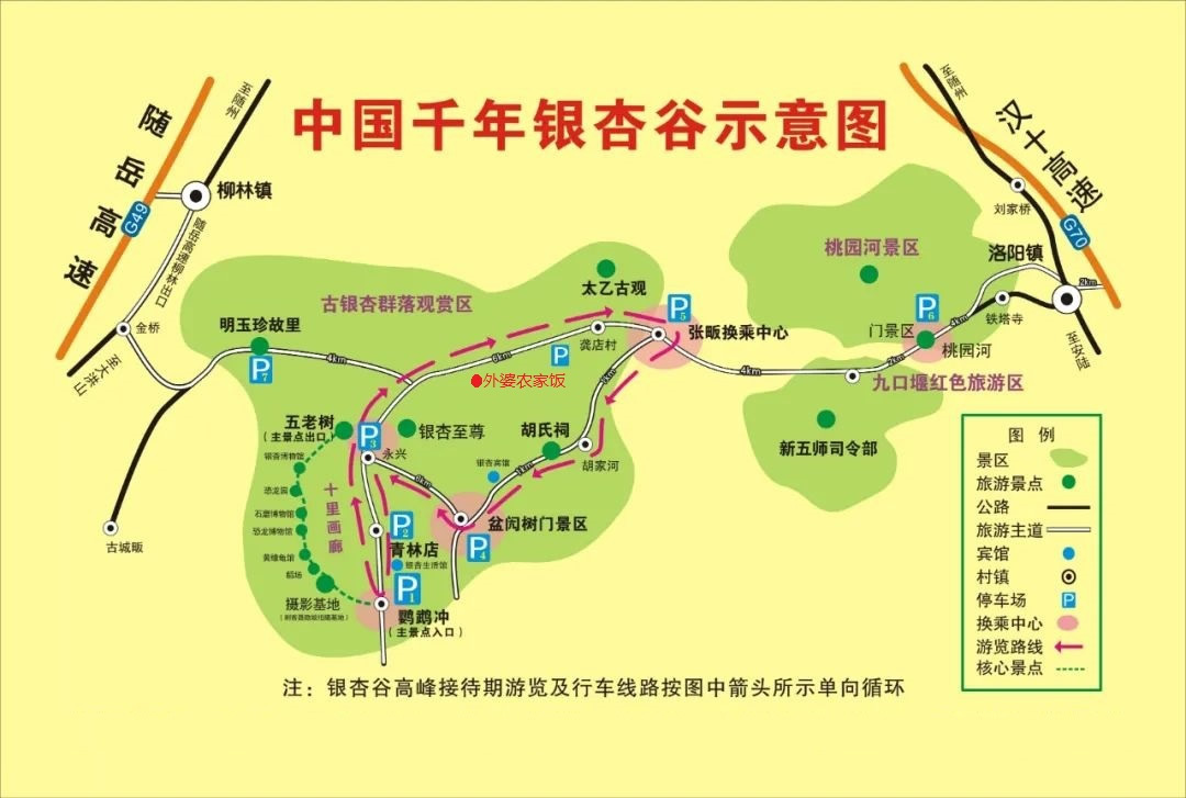 2、隨州:從隨州市區(qū)出發(fā),沿迎賓大道(在隨州職業(yè)技術(shù)學(xué)院、白云山國賓酒店斜對面約2公里)左轉(zhuǎn),過 浪河村抵達(dá)洛陽鎮(zhèn)千年銀杏谷景區(qū),全程31公里。