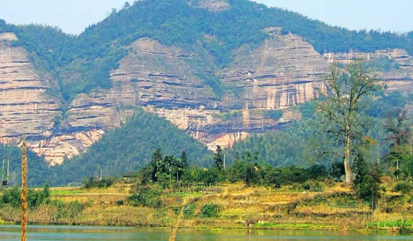 銅梁山位于湘潭縣石鼓鎮(zhèn)境內(nèi),山脈海拔700多米,地勢(shì)極為偏僻,正好處于湘潭縣與雙峰縣的交界之處。銅梁山名稱由來(lái)還有個(gè)美麗的傳說。在雙峰縣井字鎮(zhèn)與湘潭縣、湘鄉(xiāng)市交界處,有一座大山叫昌山。主峰靈應(yīng)峰海拔755.1米,是南岳72峰之一。在主峰與鷹尖石之間,橫臥著一條長(zhǎng)達(dá)2公里的一字形平脊嶺,當(dāng)?shù)厝私兴?ldquo;一字大脊”。相傳有一仙人挑著兩個(gè)大小不一的籮筐,掌燈時(shí)分就來(lái)到了大山腳下的花山村。熱情好客的花山人見了這位外來(lái)客人,格外歡喜,他們以美酒佳肴相陪,不知不覺已到雞鳴。仙人突然想起師父“雞鳴前一定要翻過大山”的教誨,趲告辭,挑起擔(dān)子飛也似的上山去?墒牵涂偷幕ㄉ饺艘粫(huì)兒便發(fā)現(xiàn),那人的擔(dān)子擱在了山頂,扁擔(dān)成了一條“一字脊”,兩個(gè)籮筐便成了一字脊兩端的“巒柱”,形似一個(gè)巨大的銅梁。因此,銅梁山這個(gè)美名便叫開了。