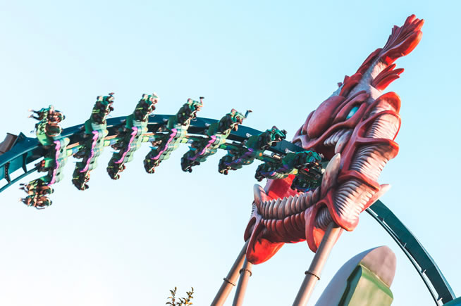 美好時(shí)光版的過山車非時(shí)光飛車莫屬,翻轉(zhuǎn)俯沖夠勁卻能穩(wěn)穩(wěn)的飛馳,墜落感在耳邊呼嘯,刺激感被歡樂的氣氛?qǐng)F(tuán)團(tuán)包圍。
