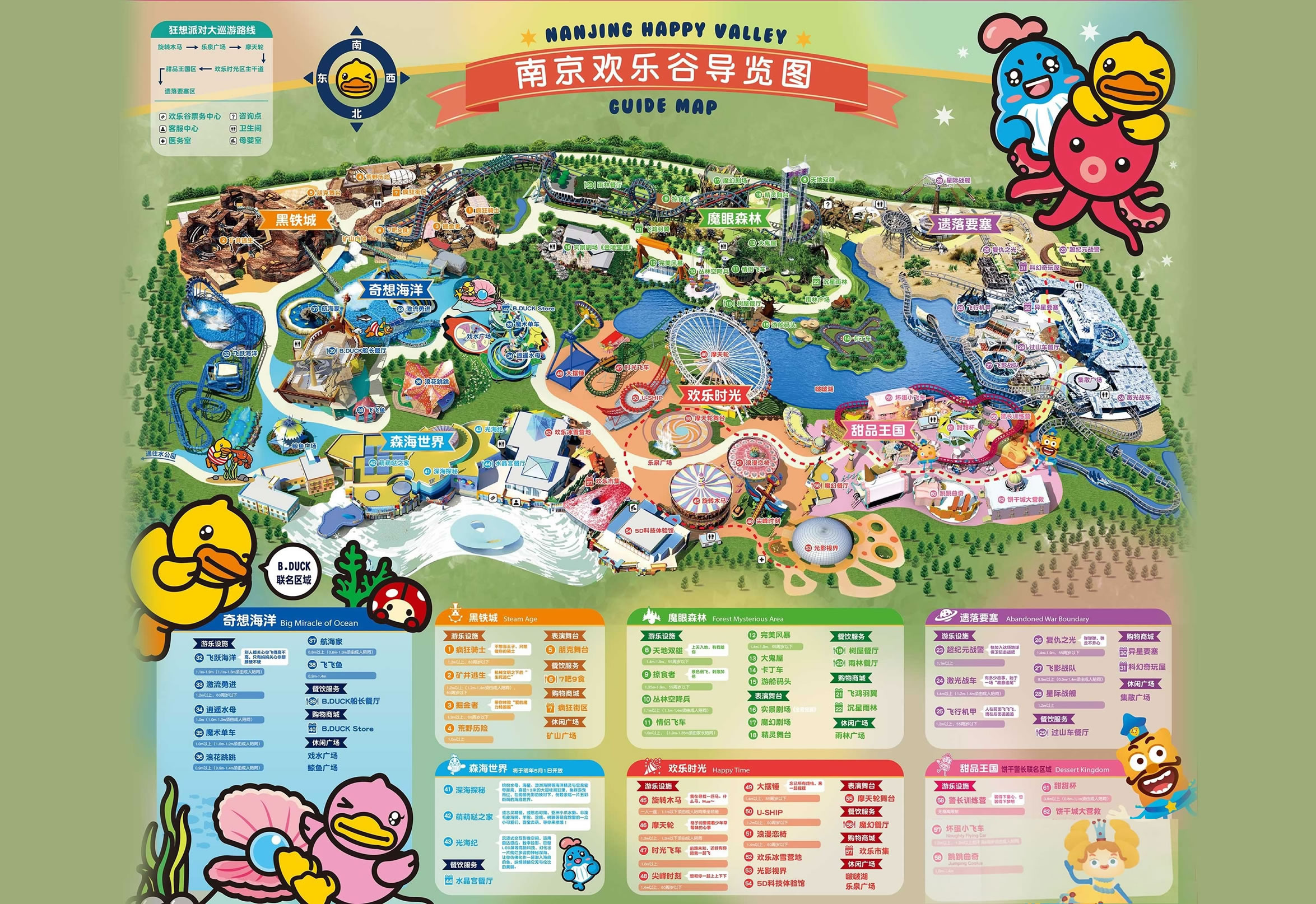 南京歡樂谷擁有歡樂時(shí)光、遺落要塞、甜品王國、黑鐵城、奇想海洋、魔眼森林六大園區(qū),與香港知名品牌B.Duck小黃鴨、動(dòng)畫IP餅干警長進(jìn)行了創(chuàng)意聯(lián)動(dòng)。此外,南京歡樂谷首次在樂園中融入硬核蒸汽朋克風(fēng),推出集復(fù)古情懷、機(jī)械美學(xué)、哥特建筑等特色于一體的區(qū)域“黑鐵城”,為城市青年的假日休閑注入了更多的潮玩基因。
