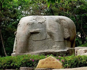 從龍洞西行,在林木掩映的山坡上.屹立著一座碩大的漢代圓雕石象。石象依一塊花崗巖巨石的自然形狀雕刻而成雕刻而成,象身高2.6米,長4.8米,背寬3.5米,石像耳闊體肥,四肢健壯,長鼻巨牙、卷尾粗足,形態(tài)雄奇,豐滿肥碩。象身西側(cè)有一高0.88米,寬0.49米,深0.2厘米的陰鑿凹面,系未見刻銘的題榜,象身東側(cè)以陰線刻一高1.13米,寬0.62米的方框,內(nèi)刻隸書“象石”字樣,在刻銘與象前腿之間,還鑿刻了一個頭梳“丁”字形發(fā)髻,手持勾鞭,腳帶鐐銬高0.92米的馴象奴。象的四足均踏著蓮花,體現(xiàn)了佛教中六牙白象王在水中步步蓮花的故事傳說。它是孔望山漢代佛教造像有機整體中不可分割的一部分。此石系目前我國發(fā)現(xiàn)的東漢時期最大的圓雕石刻,石象南側(cè)約一百五十米處,還有與此同時期的石雕鎮(zhèn)海蛙,此蛙為當(dāng)時鎮(zhèn)海之物。體長240厘米,寬220厘米,通高110厘米,石蛙頭部略損,前兩肢半殘,眼睛陰刻,背上遍刻陰線鱗紋。這兩座石雕,別特是石象,氣勢雄偉,造型精美。均為我國珍貴的石刻藝術(shù)珍品。