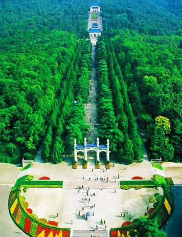 中山陵前臨平川,背擁青嶂,東毗靈谷寺,西鄰明孝陵,整個(gè)建筑群依山勢(shì)而建,由南往北沿中軸線逐漸升高,主要建筑有博愛坊、墓道、陵門、石階、碑亭、祭堂和墓室等,排列在一條中軸線上,體現(xiàn)了中國(guó)傳統(tǒng)建筑的風(fēng)格,從空中往下看,像一座平臥在綠絨毯上的“自由鐘”。中山陵建筑融匯中國(guó)古代與西方建筑之精華,莊嚴(yán)簡(jiǎn)樸,別創(chuàng)新格。