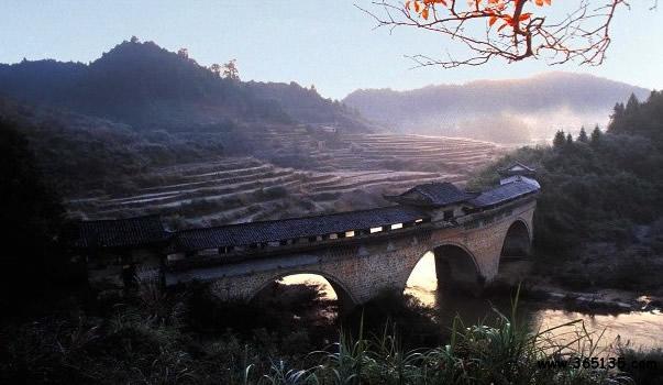 玉帶橋:因其弧形如玉帶,故名。玉帶橋?yàn)楫?dāng)?shù)馗晃逃囡L(fēng)歧募資建于清乾隆五年(公元1740年),又名“風(fēng)歧橋”。玉帶橋?yàn)槎杖孜輼鞘焦皹颍瑯蛏沓苫⌒,橋長(zhǎng)88.15米,是江南現(xiàn)存最長(zhǎng)的弧形廊橋,它以結(jié)構(gòu)獨(dú)特,氣勢(shì)雄偉而聞名贛粵。留下了“遠(yuǎn)近聞名玉帶橋,兩岸峻峰入云霄。奔騰河水瀉千里,玉帶飛鎮(zhèn)兩山腰”的贊譽(yù)。