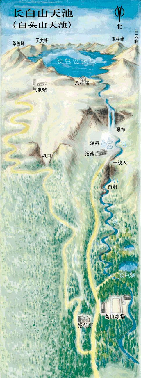 二道白河直接發(fā)源于長白山天池,是第西流松花江的正源,鴨綠江發(fā)源于長白山天池南麓,圖們江源于長白山天池東麓。 [10]天池北側(cè)有一缺口,古稱闥門,水北流稱乘槎河(又稱通天河)。該河夾流在天豁峰與龍門峰之間,全長1250米,在其盡頭形成高達(dá)68米的長白瀑布,瀑布下有長白溫泉,均與二道白河相通。