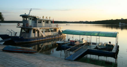 凈月潭水上游覽船舶集水上交通運(yùn)輸、游覽于一體。從任何一處碼頭上船都可以通向風(fēng)景區(qū)的幾個(gè)主要景點(diǎn):大壩碼頭、沙灘浴場碼頭、橡樹灣碼頭(森林浴場)、滑雪場。凈月潭現(xiàn)有兩艘主要船舶。其中“乘風(fēng)號”游船系雙層雙體燃?xì)猸h(huán)保型游覽船舶,定員 100位。游客可在乘坐游船的同時(shí)觀賞凈月潭水的秀色。而“麒龍?zhí)枴笔且凰椰F(xiàn)代船舶,客艙內(nèi)配有電視、音樂,為游客播放凈月潭相關(guān)視頻,二層甲板處更是觀光遠(yuǎn)眺凈月風(fēng)景的好地方。凈月潭又從日本購進(jìn)多輛三座位的“水上摩托艇”,速度快、較刺激,可供游客自行駕駛。由“摩托艇”牽引,游人還可踩滑水板滑翔于潭面。由“快艇”牽引,乘坐五座位的火箭沖浪艇,也極具刺激性。