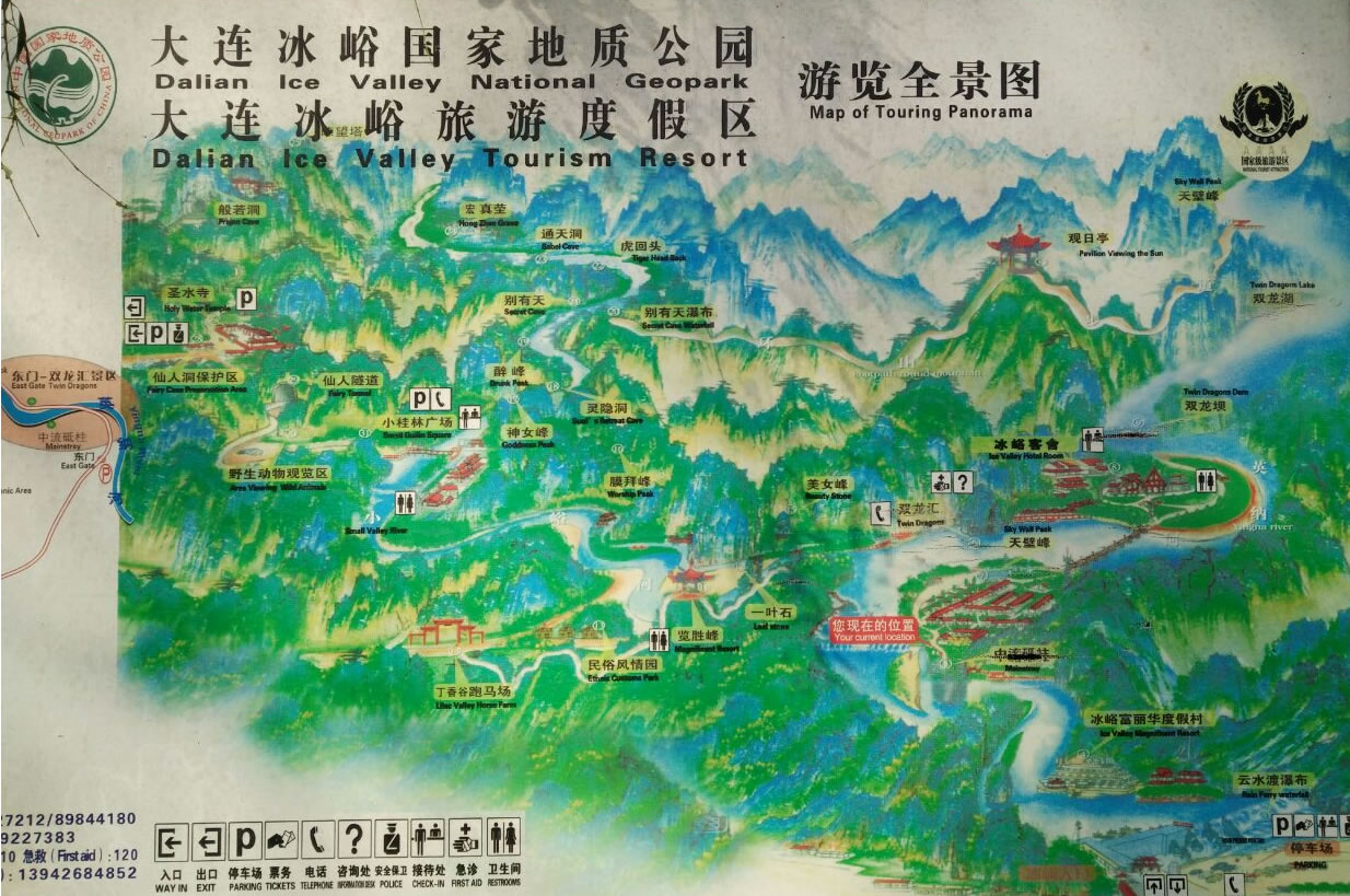 所謂北溝,指的是英納河流經的溝谷,而南溝則是指小峪河流經的溝谷,冰峪的主要景點大都被兩條河貫穿著。英納河是滿語“因納輝”的音譯,意為美麗的地方,河長94.9公里,是莊河境內最長的一條河流。莊河市的淡水資源占大連地區(qū)首位,而英納河的淡水則在莊河市的首位。為了增加碧流河水庫的容量,大連市已于2001年5月引英納河的水進入了碧流河水庫。據化驗,在英納河水中含有23種微量元素,具有抗癌和健身爽膚等多種功效。冰峪石林地貌比較集中,山峰連成一片,而有的地方卻是孤峰突兀,頗有點小桂林的味道。又有人稱其為“天然大盆景園”,因為景區(qū)內有“大象吸水”、“金雕”、“豬馱龜”等許多奇景。