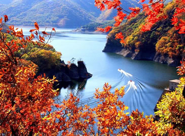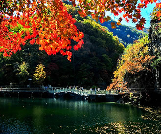 關(guān)門(mén)山是以楓葉著稱的,楓葉多得讓你數(shù)不過(guò)來(lái),美得讓你感覺(jué)像是走進(jìn)了仙境,紅得是一團(tuán)大火焰。這里的楓葉一片綴連著一片,一株綴連著一株,像火焰,像扇子,形態(tài)萬(wàn)千,千姿百態(tài)。關(guān)門(mén)山的楓葉不僅美麗,而且山也是那般雄偉,水也是那般清澈。