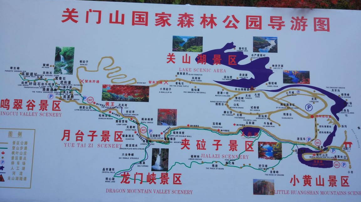 森林公園內(nèi)有四大景區(qū)小黃山景區(qū)、夾砬子景區(qū)、龍門(mén)峽景區(qū)和月臺(tái)子景區(qū),共計(jì)108處景點(diǎn)。它有三道門(mén):北門(mén),在小市方向,雙峰對(duì)峙,中間拱橋相連;南門(mén),在去湯溝的嶺頂,公路從中穿過(guò),十分險(xiǎn)要;中門(mén),在深谷河道中,“雙扉”夾水,寬只二十余米,為興修水庫(kù)的天然門(mén)柱,有人把關(guān)門(mén)山風(fēng)景譽(yù)為“小江南”,“賽黃山”,說(shuō)它有五美:山美,陡峭,俊秀,似一簇簇盆景;樹(shù)美,樹(shù)木種類繁多,特別是秋天的楓葉,冬季植根于峭壁上的蒼松,非常壯觀;水美,湯河穿過(guò)山谷,匯集小溪,飛瀑,“奪門(mén)”而出,似來(lái)自于天際;花美,天女木蘭,山杜鵑,漫山遍野;云美麗,清晨雨后,山谷中云霧繚繞,如披輕紗,分外嫵媚。歷代文人多有詩(shī)篇贊頌,許多美術(shù)工作者,經(jīng)常到這里寫(xiě)生、作畫(huà)。