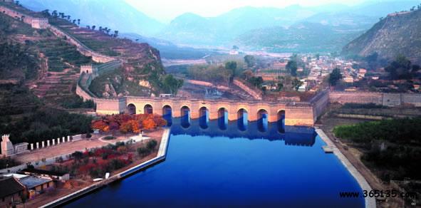 九門口長城:坐落在遼寧省綏中縣李家鄉(xiāng)新臺子村境內(nèi),距山海關(guān)15公里,全長1704米。其南端起于危峰絕壁間,與自山海關(guān)方向而來的長城相接。自此,長城沿山脊向北一直延伸到當(dāng)?shù)氐木沤幽习,在寬達(dá)百米的九江河上,筑起規(guī)模巨大的過河城橋,以此繼續(xù)向北逶迤于群山之間。“城在水上走,水在城中流。”便是人們對九門口長城的形象描述。