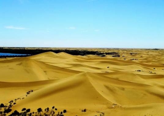 庫(kù)布齊沙漠,是中國(guó)第七大沙漠,在河套平原黃河“幾”字彎里的黃河南岸(有的人稱河套沙漠),往北是陰山西段狼山地區(qū)!皫(kù)布其”為蒙古語(yǔ),意思是弓上的弦,因?yàn)樗幵邳S河下像一根掛在黃河上的弦。古稱“庫(kù)結(jié)沙”、“破訥沙”,亦作“普納沙”。庫(kù)布齊沙漠是距北京較近的沙漠。位于鄂爾多斯高原脊線的北部,內(nèi)蒙古自治區(qū)鄂爾多斯市的杭錦旗、達(dá)拉特旗和準(zhǔn)格爾旗的部分地區(qū)。長(zhǎng)400公里,寬50公里,總面積約1.39萬(wàn)平方公里,流動(dòng)沙丘約占61%,沙丘高10~60米,像一條黃龍橫臥在鄂爾多斯高原北部,橫跨內(nèi)蒙古三旗。形態(tài)以沙丘鏈和格狀沙丘為主。