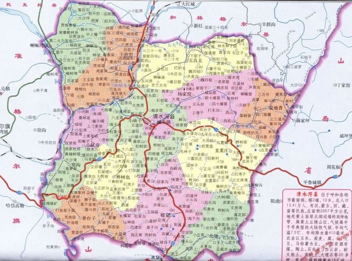 清水河縣因境內(nèi)有清水河而得名。位于內(nèi)蒙古自治區(qū)中部,呼和浩特市最南端。東南與山西省平魯縣、偏關(guān)縣為鄰,西隔黃河與伊克昭盟準格爾旗相望,北連和林格爾縣、托克托縣。面積2859平方公里。