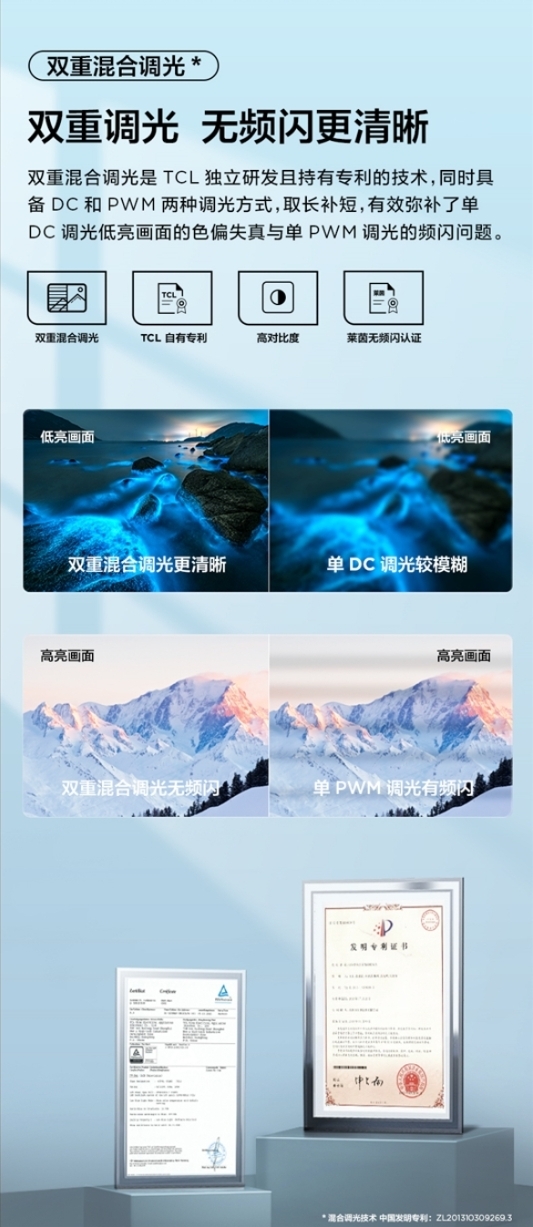 在混合調(diào)光技術(shù)方面,TCL特地研發(fā)了綜合采用DC調(diào)光和PWM調(diào)光的混合調(diào)光技術(shù),能夠通過對當(dāng)前畫面亮度的動態(tài)分析,智能調(diào)節(jié)背光系統(tǒng)工作模式,使畫面高亮不閃爍,同時還能起到改善畫質(zhì),節(jié)約能耗(5%-15%)。