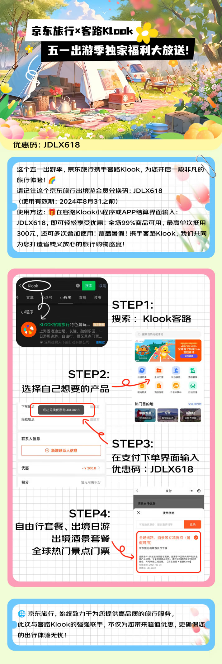 目前,中國已和23個國家實現(xiàn)全面互免簽證。相關(guān)平臺數(shù)據(jù)顯示,今年“五一”出境游熱度飆升,新近免簽的新馬泰更是熱門之選。泰國曼谷芭提雅6日游,帶你去曼谷逛大皇宮、芭提雅看人妖表演、沙美島出海,還提供五星酒店住宿、泰式美食盛宴等,僅5199元起。想自由行,推薦4759元起的馬來西亞吉隆坡6天5晚游,包含北京直飛往返機票以及1晚網(wǎng)紅酒店住宿。值得關(guān)注的是,京東旅行還攜手專注于境外目的地的旅游體驗預(yù)定平臺客路Klook送上獨家福利。消費者在Klook小程序或者APP下單任何產(chǎn)品,輸入優(yōu)惠碼JDLX618,單次下單享至高300元優(yōu)惠,覆蓋全場99% 商品,且可多次疊加使用。