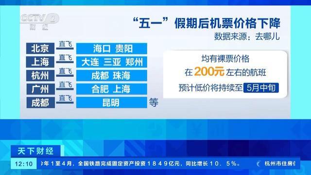 旅游平臺數據顯示,5月6日至5月8日,機票平均支付價格環(huán)比一周前(5月1日—5月3日)下降14%。目前,從北京直飛?、貴陽,上海直飛大連、三亞、鄭州,杭州直飛成都、珠海,廣州直飛合肥、上海,成都直飛昆明等航線,均有裸票價格在200元左右的航班。預計機票低價將持續(xù)至5月中旬。(來源:央視財經)