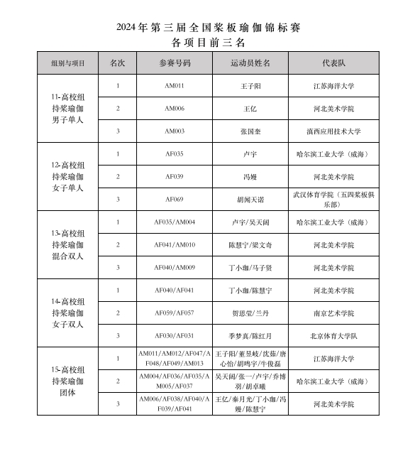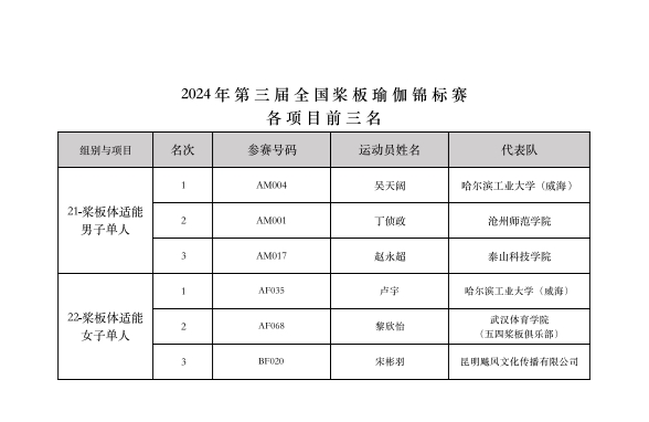 最終經(jīng)過為期兩天的激烈競賽,“意爾康杯”2024年第三屆全國槳板瑜伽錦標(biāo)賽共決出槳板瑜伽、持槳瑜伽、槳板體適能等3大類共22項比賽各項前三名的獲獎名次。