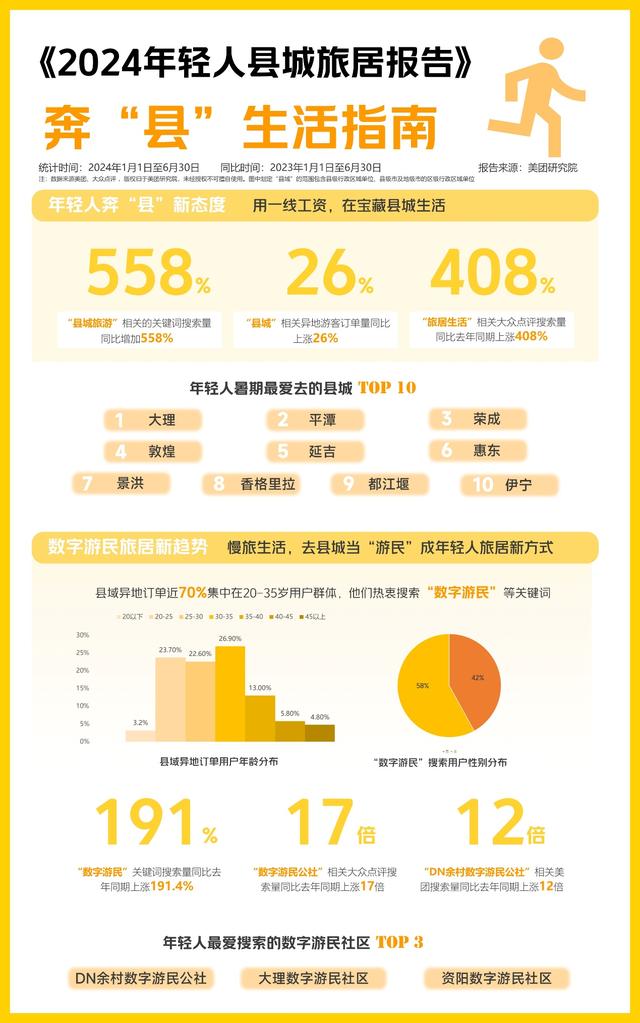 美團(tuán)近期發(fā)布的《2024年輕人縣城旅居報(bào)告》(下稱《報(bào)告》)顯示,今年暑期,大理、平潭、榮成、敦煌、延吉為年輕人最愛去的縣城。這些年輕人熱衷搜索“數(shù)字游民”“旅居”等關(guān)鍵詞,“數(shù)字游民公社”大眾點(diǎn)評搜索量同比去年同期上漲17倍。