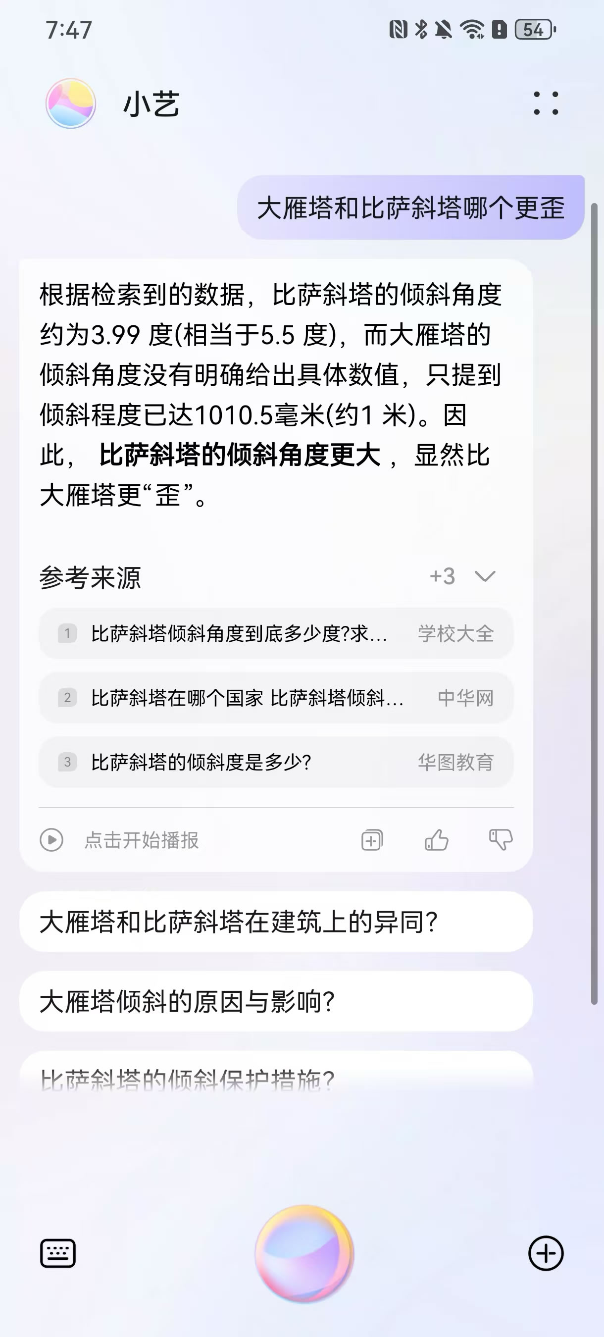 確定好目的地之后,到底怎么玩?對(duì)大多數(shù)人來(lái)說(shuō),既要規(guī)劃詳細(xì)、又要細(xì)節(jié)不出紕漏的“完美旅行攻略”非常費(fèi)時(shí)費(fèi)力。而小藝可以從特色景點(diǎn)、住宿、餐飲、注意事項(xiàng)等多個(gè)維度出發(fā),結(jié)合用戶確定的旅行目的地,為你解答各種旅行知識(shí),堪稱旅行界的百科全書。用戶只需長(zhǎng)按華為手機(jī)電源鍵或者對(duì)手機(jī)說(shuō)“小藝小藝”即可喚醒小藝,不論是詢問(wèn)當(dāng)?shù)氐娜宋闹R(shí)、歷史典故,還是推薦熱門景點(diǎn)、美食小吃,小藝都能對(duì)答如流,幫助大家更快速了解目的地的相關(guān)信息。比如你可以直接問(wèn)它“為什么景德鎮(zhèn)的瓷器很出名”、大雁塔和比薩斜塔哪個(gè)更歪” “為什么很多人喝不慣北京豆汁兒”,通過(guò)各種問(wèn)題逐漸了解到目的地的各種信息,幫助提升旅行體驗(yàn)。