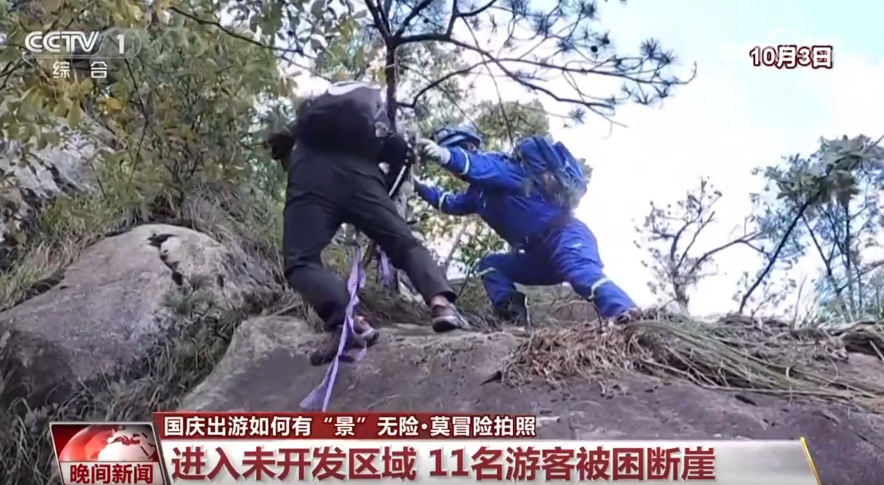 10月2日傍晚,有11名外地游客在安徽績溪縣一座未開發(fā)的山上攀爬時,因為迷路導(dǎo)致被困,當(dāng)?shù)毓埠兔耖g救援隊立即展開聯(lián)合救援。在3日凌晨一點多,救援人員找到了被困游客,由于游客被困的地方是未開發(fā)的區(qū)域,山勢十分陡峭,且有多處斷崖,救援人員只能反復(fù)利用繩索,將被困游客挨個兒送至安全地帶。
