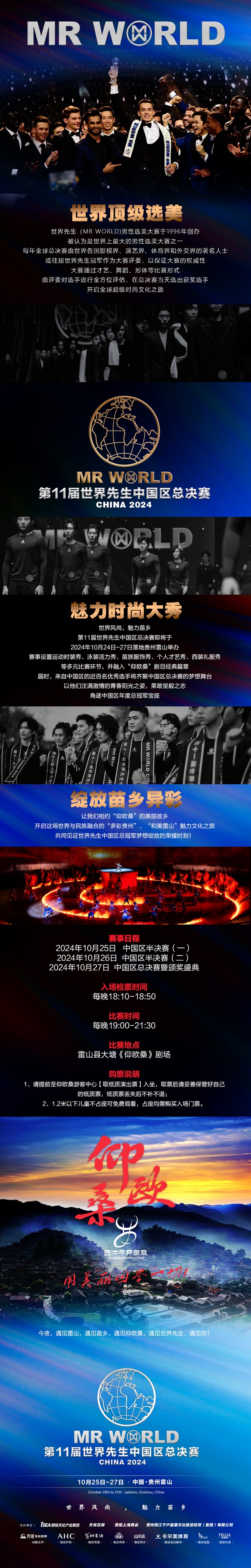 2024年10月24日至27日,第 11 屆世界先生中國區(qū)總決賽將在美麗的貴州雷山拉開帷幕。“世界先生”走進(jìn)雷山,走進(jìn)“仰歐桑”的美麗故鄉(xiāng),以他們注滿激情的青春陽光之姿,果敢堅毅之志,開啟一場世界與民族融合的“多彩貴州”、“和美雷山”魅力文化之旅!