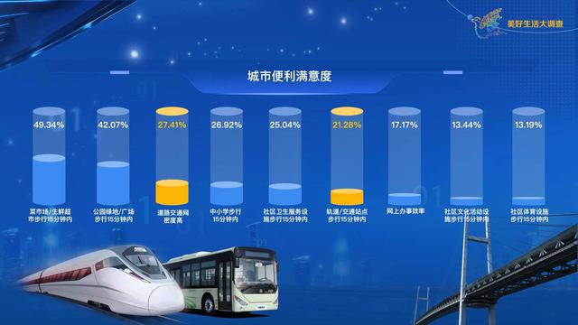 交通的改善大大提高了生活的便利度。其中,道路網(wǎng)密度高和軌道/交通站點步行15分鐘內這兩項的滿意度都位居城市便利度方面的第二梯隊。