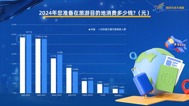 《美好生活大調查》發(fā)現(xiàn),對交通方面滿意人群,預計旅游消費在5000至9999元和10000至19999元的占比都高出均值2個百分點。