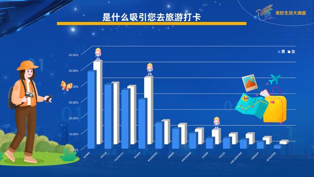《美好生活大調查》發(fā)現(xiàn),自然景觀是吸引大家去旅游打卡的最主要因素,有將近一半的人會因此選擇旅游目的地。名勝古跡、歷史民俗文化和特色美食緊隨其后。不同人群中,女性對城市的特色美食超級偏愛,因為特色美食去一個城市旅游的女性占比高出男性11個百分點以上。跟女性相比,男性對名勝古跡和特色民宿/酒店更感興趣一點。