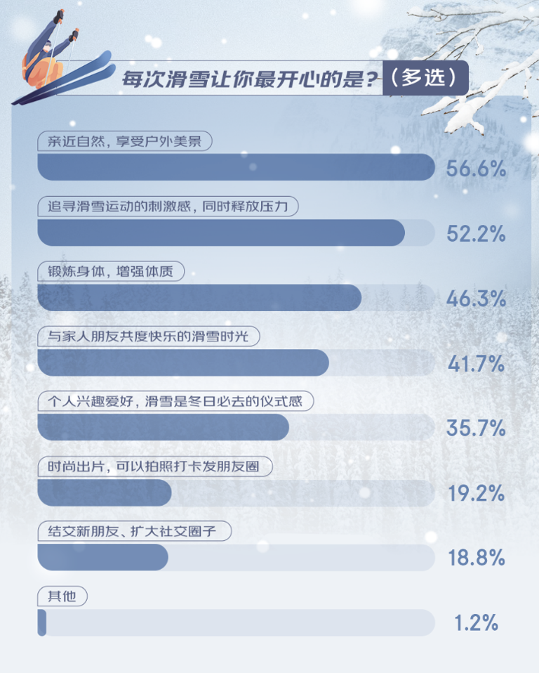 來自深圳的年輕程序員林小嫻是一名滑雪發(fā)燒友。自前年自己首次嘗試滑雪,便被雪道上飛馳的自由與刺激深深吸引,她感慨地說:“滑雪讓我重新定義了冬季的樂趣,每一次滑行都是一次心靈的釋放。”在調(diào)研中,許多人表達(dá)了對滑雪帶來的自由、挑戰(zhàn)與樂趣的深切熱愛,有56.6%的人表示,親近自然、享受美景是他們滑雪時(shí)最開心的時(shí)刻;52.2%的人渴望追尋滑雪運(yùn)動(dòng)的刺激感、釋放壓力;此外,強(qiáng)身健體、與家人朋友共度時(shí)光、結(jié)交新朋友也是滑雪讓人開心的體驗(yàn)。