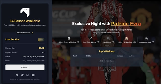 此外,活動現(xiàn)場將見證 STAYNEX 與 Patrice Evra 的簽約儀式,并獲取精美禮品、幸運(yùn)抽獎和獨家優(yōu)惠。具體相關(guān)權(quán)益或競拍鏈接以及競拍教程請查看STAYNEX.VIP 官方說明。