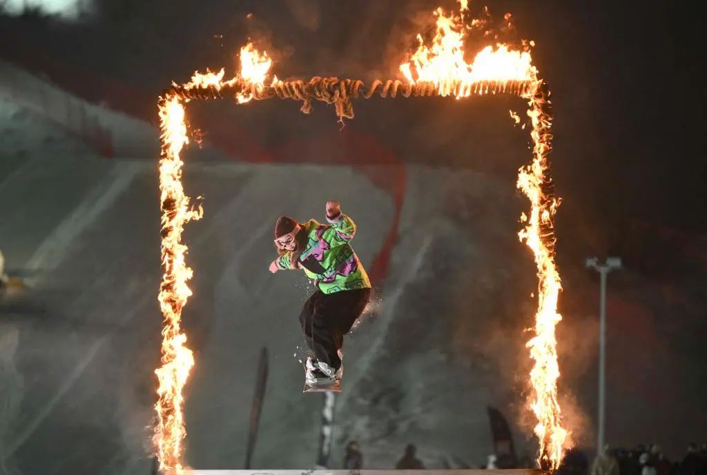 1月29日,雪友在新疆將軍山國際滑雪度假區(qū)新春趣味滑雪公園跳臺活動上鉆過火圈。新華社記者胡虎虎 攝