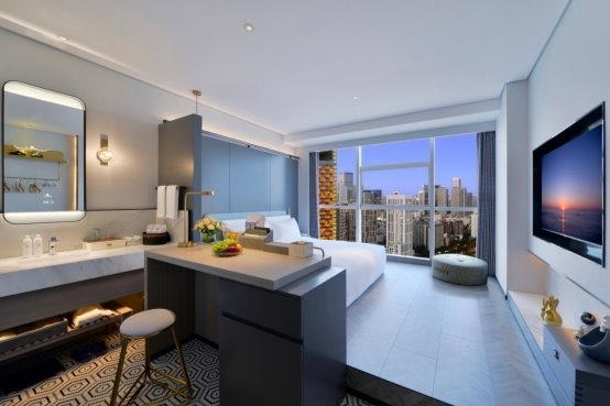 客房哲學(xué):320間客房搭配全景落地窗設(shè)計,干濕分離設(shè)計搭配臨窗浴缸,申寶冷暖床墊實(shí)現(xiàn)“冬暖夏涼”智能溫控,高端雅蘭布草,細(xì)節(jié)處彰顯東方待客之道。