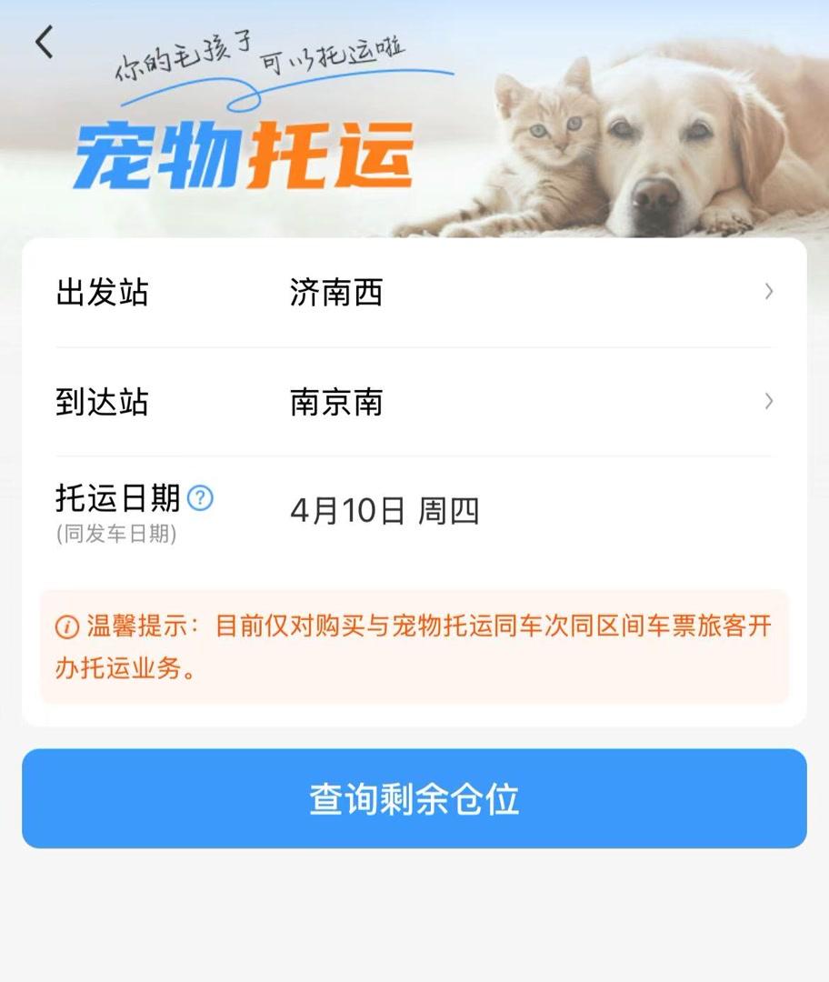 記者查詢鐵路12306App發(fā)現(xiàn),在“全部應(yīng)用”頁(yè)面“精選應(yīng)用”板塊,“寵物托運(yùn)”功能已經(jīng)上線。點(diǎn)擊“預(yù)約下單”,填寫選擇出發(fā)站、到達(dá)站以及托運(yùn)日期后,再點(diǎn)擊“查詢剩余倉(cāng)位”,托運(yùn)旅客即可查詢剩余寵物倉(cāng)位,并從車票訂單或本人車票中選擇已購(gòu)買的車票信息進(jìn)行關(guān)聯(lián)。