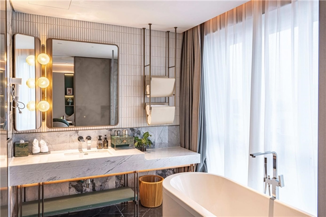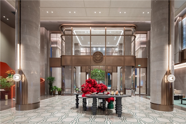 酒店由法國設(shè)計師Jave操刀設(shè)計,以"楚韻新譯"為理念,巧妙融合現(xiàn)代奢華元素與荊楚文化傳統(tǒng)特色,打造出既具時代風(fēng)尚又飽含文化底蘊的獨特空間。大堂主體采用大面積玻璃幕墻,搭配莫蘭迪紅綠配色點綴,白天,陽光透過玻璃傾灑,大堂內(nèi)溫馨明亮,宛如璀璨水晶宮殿;夜晚,借助精妙燈光設(shè)計,呈現(xiàn)出迷人光影效果,成為城市夜色中耀眼的明珠。