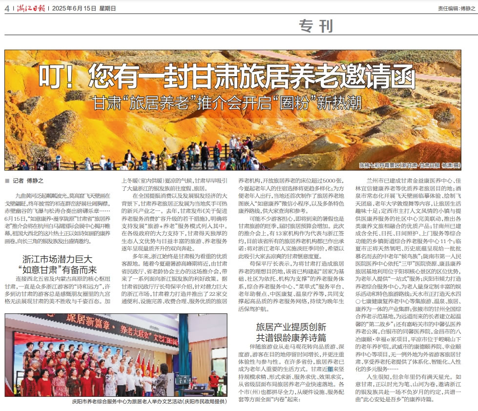 作為中國(guó)最大的游客輸出省之一,浙江始終是甘肅極為看重的優(yōu)質(zhì)客源地。隨著2025年度的夏季避暑游高峰期將近,6月15日,“如意康養(yǎng)·漫享隴原”甘肅省“旅居養(yǎng)老”推介會(huì)正式走進(jìn)杭州,本次大會(huì)由甘肅省民政廳、甘肅省老齡協(xié)會(huì)主辦,甘肅省福利彩票發(fā)行管理中心協(xié)辦,來(lái)自浙隴兩地民政部門、養(yǎng)老機(jī)構(gòu)、旅行社、新聞媒體圈的數(shù)百位嘉賓與市民游客參加了本次推介活動(dòng)。