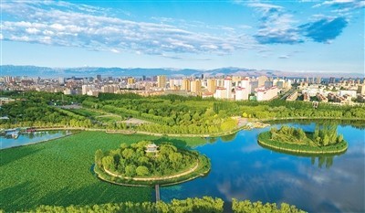 雨后初晴的甘肅省張掖國(guó)家濕地公園碧水藍(lán)天,綠意盎然,景美如畫(huà)。