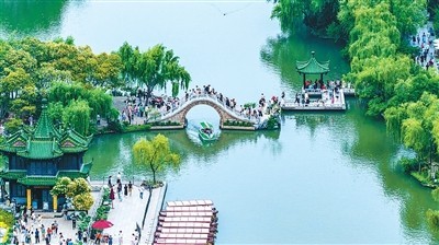 隨著“蘇超”破圈,江蘇揚(yáng)州借勢(shì)發(fā)力,推出“看球+賞景”文旅套餐,圖為游客在瘦西湖風(fēng)景區(qū)賞景游玩。