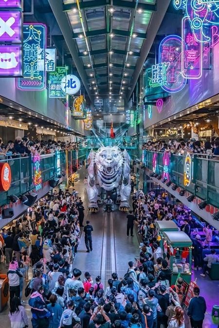 熊洞街是一個(gè)由4800平方米廢棄工業(yè)廠房改造的沉浸式IP樂(lè)園,樂(lè)園里有巨獸巡游、時(shí)尚文創(chuàng)、科技研學(xué)、特色美食等元素,用文化、科技、藝術(shù)結(jié)合的方式,打造了一個(gè)“尖叫地標(biāo)”,并通過(guò)“巨熊北北”這個(gè)超級(jí)IP,把文旅和商業(yè)業(yè)態(tài)有機(jī)融合在一起。