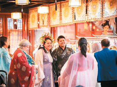 外國(guó)游客在深圳錦繡中華民俗村身穿漢服沉浸式游園。