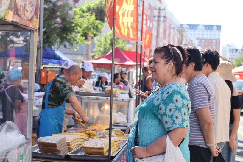 這是俄羅斯游客黑河早市選購早餐(7月8日攝)。新華社 記者 姜思妮 攝