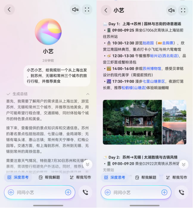 對(duì)于多城聯(lián)游來說,行程規(guī)劃十分復(fù)雜。在鴻蒙5的加持下,擁有全新大腦的對(duì)話思考式小藝變得“更聰明”,能理解用戶需求并給出針對(duì)性的回答。用戶只需對(duì)小藝說出需求,例如:“小藝小藝,給我規(guī)劃一個(gè)蘇錫常園林和美食主題三日游。”小藝便能迅速生成一份詳盡的圖文攻略,將蘇州的古典園林、無錫的太湖風(fēng)光,以及常州獨(dú)具特色的中華恐龍園都囊括其中,給出路線、交通、美食等建議。旅途中遇到感興趣的建筑或是不認(rèn)識(shí)的植物,也可以隨時(shí)拍照后拖給小藝或圈選屏幕問問小藝,即時(shí)獲得百科解答,讓旅途充滿探索的樂趣。